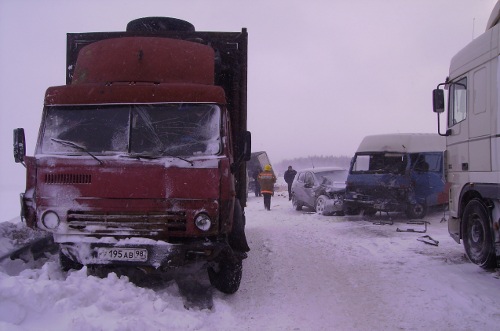 По информации карельского управления ГИБДД, днем 24 февраля в Сегежском районе на 705-м километре автодороги «Кола» в условиях метели и недостаточной видимости произошло столкновение автомобилей «Нива» и «Тойота-Карина», двигавшихся во встречном направлении. В ДТП получили травмы оба водителя и 2 пассажира «Нивы». Через 10 минут в ста метрах от указанного ДТП водитель «КамАЗа» врезался в стоявшие на обочине автомобили: грузовую «Газель», 2 микроавтобуса Фольксваген, после чего столкнулся с «Ниссан-Кашкай». В ДТП получил травмы водитель одного из микроавтобусов. Пострадавшие обоих происшествий были госпитализированы.