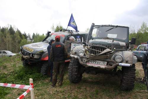 «Маленький мул» на боггерах также стремительно шел по спецучасткам. Однако на очередной канаве автомобиль сместило с трассы и развернуло поперек дороги. Возможно, сказалась особенность резины — боггеры имеют очень сильный боковой снос. Следом за ними к месту происшествия прибыл экипаж Александра Чернова, который решил объехать «Мула». Это можно было сделать только через участок «Спорта». В результате обе машины устроили личную гонку на лебедках. При этом деревьев, за которые можно было бы зацепиться, не наблюдалось в округе, так что с разрешения организаторов «лебедились» за машину эвакуации — «ГАЗ 66». Временами возникало ощущение, что участники скорее стащат эвакуатор в воду, нежели выберутся сами. Таким был первый СУ у «Серии». «Летчики» на этом же спецучастке повредили сцепление, однако успели починиться, не нарушив регламента.