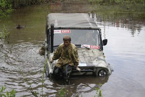 В то же время участникам «Спорта» предоставили выбор для прохождения СУ1 или СУ2. Последний представлял собой лужу, из которой никто без лебедки выбраться не смог. Экипаж «Железяка» начал постройку машины 4 месяца назад. 22 мая был их дебют на Кубке города. Они ринулись в лужу без лебедки, справились, но что-то случилось с карбюратором, что отразилось на прохождении следующего участка. Пришлось ремонтироваться. Хотя ясно, что воды пока машина не любит. Экипажи из Чалны, «Леший» и «Хромой», не стали долго церемониться и решили проходить СУ парой. Вытащили «Железяку». Те, кто когда-то уже участвовал в Кубке города, проехали этот спецучасток без труда. «Авиаторы» даже успели поработать эвакуатором. Кстати, этот экипаж впервые не пошел ни в «Серию», ни в «Спорт» — автомобиль проходил тестирование после ремонта и подготовки к трофи-рейду «Ладога».