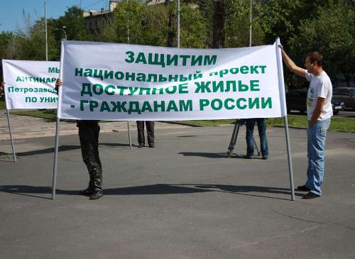 «В мэрии, - говорит организатор пикета Михаил Кузьминский, - нам предлагают выкупить эти участки через аукцион, или приобрести участки и дома у генподрядчиков. А это делает жилье уже не таким «доступным».