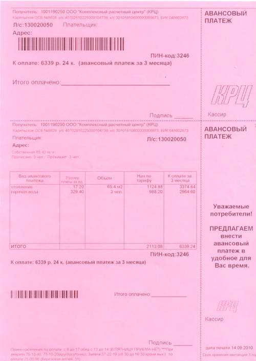 В ближайшие дни в почтовых ящиках жителей Петрозаводска появится необычная квитанция – розового цвета – на оплату коммунальных услуг. Таким образом в сентябре этого года Комплексный расчетный центр предоставит петрозаводчанам возможность оплатить коммунальные услуги авансом до конца года. Для удобства граждан и во избежание путаницы авансовая квитанция за отопление и горячую воду будет напечатана на розовой бумаге.