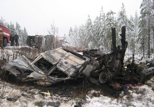 По информации карельского управления Госавтоинспекции, утром 14 ноября в Медвежьегорском районе на 642-м километре трассы «Кола» автомобиль «УАЗ-Патриот» на скользкой дороге вынесло на полосу встречного движения, где машина столкнулась с лесовозом Вольво. В результате ДТП смертельные травмы получили водитель и женщина-пассажир «УАЗа», жители Мурманска. После столкновения «Патриот» загорелся. Обстоятельства происшествия устанавливаются.