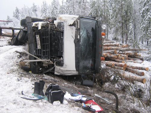 Видел вчера это место. Вольво еще на месте(поставлена на колеса). Приехал другой лесовоз, собирал бревна. Останки УАЗа не заметил, может и были.