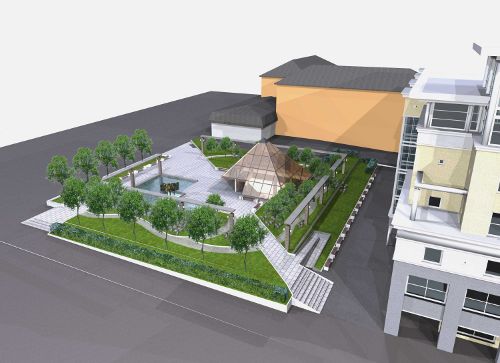 Сквер над подземным объектом останется зеленой зоной отдыха. Здесь запланированы работы по выравниванию участка, обустройству пешеходных дорожек, высадке деревьев и оформлению клумб. Фонтан по-прежнему останется. Вход в подземное сооружение будет выполнен в виде небольшой стеклянной пирамиды.