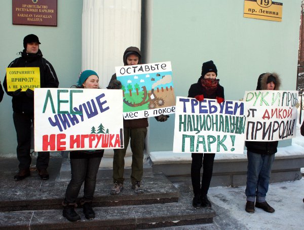 Карьеры и лесозаготовки - два основных вида деятельности, преобразующие таежную природу. И если подходить к вопросу с исключительно потребительской точки зрения, то вскоре зеленая Карелия, глядишь, рискует повторить судьбу пустыни Сахара, которая тоже когда-то была благодатным лесистым краем. За тем исключением, что там процесс опустынивания шел естественным путем в течение тысячелетий, у нас же он убыстряется искусственно за счет человеческого фактора и социально-экономических условий.Хорошей защитой против действий чиновников и лесозаготовительных компаний может стать придание статуса заповедника наиболее ценным лесным территориям. Разговор о создании особо охраняемых природных территорий ведется уже давно и вряд ли прекратится до момента, когда схема территориального планирования будет наконец принята правительством Карелии. За это бьются экологи Карелии и всей страны. Сегодня возле здания правительства РК состоялся пикет в защиту ценных лесов Карелии, и главным требованием участников акции к республиканскому руководству стало сохранение в действующей Схеме территориального планирования Карелии 60 планируемых охраняемых природных территорий.