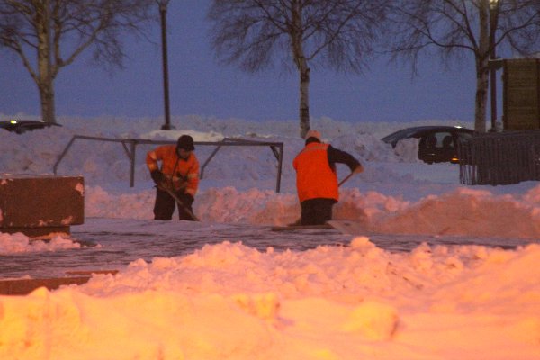Вот такую картинку можно было наблюдать сегодня утром. Бригада из 8 дворников расчищает площадку возле памятника Куусинену. Можно только порадоваться, что целая бригада работников метлы брошена на небольшой участок возле памятника. Значит, не так уж и плохо обстоят дела в городе?