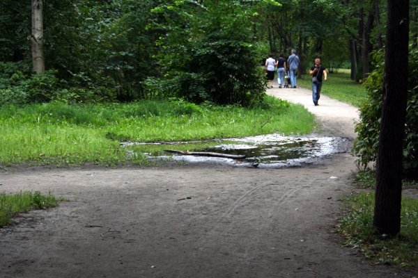 Впрочем, совсем игнорировать парк нельзя, ведь его территория - один из полигонов грядущей XIII Летней Спартакиады Союза городов Центра и Северо-Запада России. Здесь будут проходить беговые соревнования, и уже сейчас тренируются тренируются бегуны. Поэтому дорожки парка необходимо привести в порядок, и в первую очередь решить проблему большой лужи неподалеку от разбитой "патриотической" лестницы. Эта лужа, такое ощущение, никогда не высыхает, а в лучшие времена разливается на всю дорожку, и обходить ее приходится по газонам, по кустам. Как сообщили в городской администрации, беговой марафон пройдет 7 сентября, и сейчас территория парка подготавливается к этому событию - уже завезена специальная каменно-песочная смесь, которой покрывают часть дорожек, и лужу обещали засыпать. Ходить по дорожкам стало сложнее, бегать - наоборот легче. Что касается остальной территории парка, то ей придется подождать своего времени, которое наступит после 2015 года.