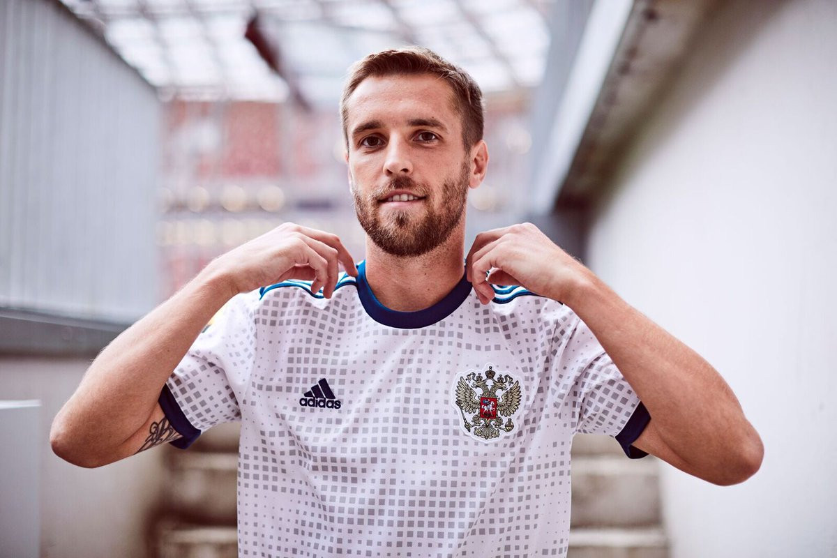 Гостевая майка теперь выполнена в белом цвете с элементами серого. На ней изображены герб Российской Федерации, а также логотип технического спонсора сборной России.
