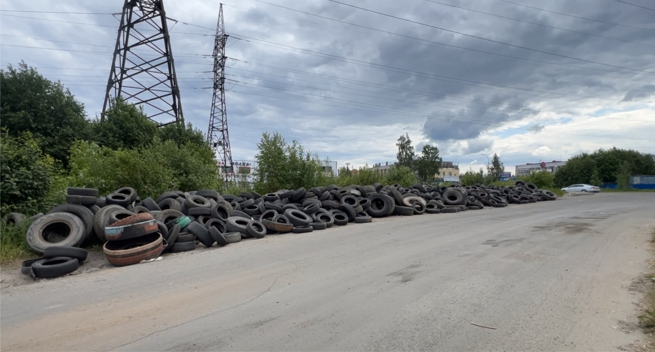 Свалка старых автомобильных шин выросла под ЛЭП в Петрозаводске