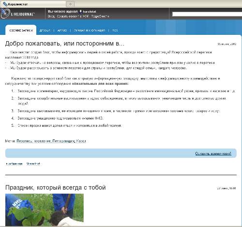 Служба государственной статистики по Карелии завела собственный блог на сервисе «Живой журнал». В нем "Карелиястат" планирует информировать население о ходе подготовки ко Всероссийской переписи населения, а также отвечать на вопросы граждан, связанные с грядущим событием.Сообщается, что блог создан в целях популяризации переписи. "Карелиястат" выражает надежду, что он станет источником самой объективной, полноценной и достоверной информации из первых рук обо всех нюансах переписной «кухни». "Карелиястат" намерен сделать эту информацию максимально доступной для всех желающих.