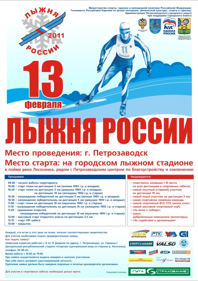 13 февраля Петрозаводск присоединится к XXIX Всероссийской массовой лыжной гонке «Лыжня России 2011», которая проходит в один день по всей стране. Об этом сегодня на общегородском совещании в Администрации Петрозаводска рассказал начальник управления физкультуры, спорта и молодежной политики Василий Филин.