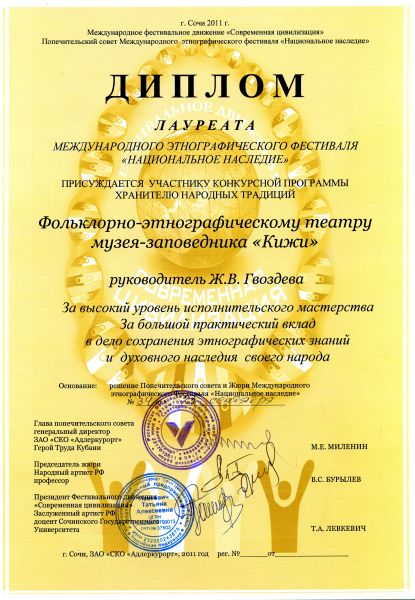 Фольклорно-этнографический театр музея-заповедника «Кижи» принял участие в I Международном фольклорно-этнографическом фестивале «Национальное наследие» и научно-практической конференции «Диалог цивилизаций, народов и культур: проблемы и перспективы», проходившем в Сочи.Впервые проходило мероприятие необычного формата, объединившее в себе фестиваль и научно-практическую конференцию. Целью такого объединения была консолидация ученых-теоретиков и практиков-исполнителей в области этнографии, этномузыкологии, этнопедагогики, культурологии, краеведения и фольклористики - специалистов, которые применяют разные подходы в изучении и освоении народной культуры. В рамках фестиваля проводились мастер-классы по исполнительству, изготовлению народной куклы, сценическому этническому костюму как результату интерпретации традиций народной одежды дизайнером; демонстрировались антропологические и краеведческие фильмы.