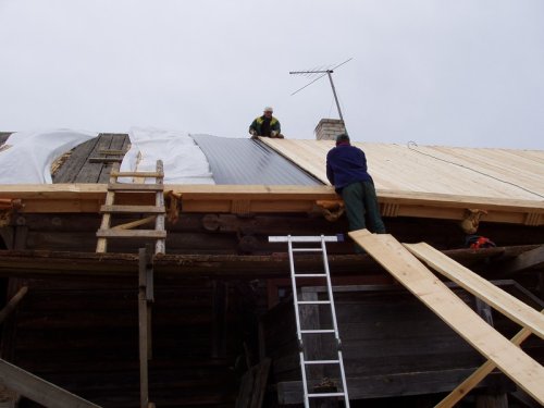 Как сообщает пресс-служба музея, новшеством проекта является применение металлического профиля, который прокладывается между тесом и подтеском. Используют его в качестве гидроизоляционного слоя. Этот способ подсказал главный хранитель недвижимых памятников музея «Кижи» Александр Любимцев. Его подразделение несколько лет назад на доме-памятнике Ананьева произвело профилактические работы на кровле дома, используя металлопрофиль. Опыт оказался удачным, и реставраторы стали его использовать при реставрации других памятников.