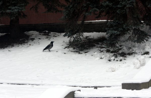 Неподалеку от редакции газеты "Всё", возле филиала КНЦ РАН под елкой сегодня утром была замечена необычная ворона. Птица сидела на земле и самозабвенно мяукала. Чего она хотела этим добиться - неизвестно. Представителей кошачьего племени рядом не оказалось, так что оценить выступление по достоинству было некому - кроме корреспондентов газеты "Всё". Предложенный кусок хлеба ворона проигнорировала, на ответное мяуканье посмотрела осуждающе.
