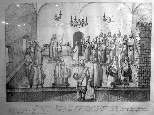 Собственно, путевые заметки Августа Майерберга и легли в основу идеи путешествия, давшей основу концепции выставки. Эти работы стали основой для издания в 1827 году альбома «Путешествие по России». На выставке можно увидеть около двух десятков листов этого уникального издания. В альбоме запечатлены панорамы русских городов XVII века, картины жизни России времен царствования Алексея Михайловича. Кроме того, в экспозиции выставлена серия портретов династии Романовых французского гравера Ж. Мекю.