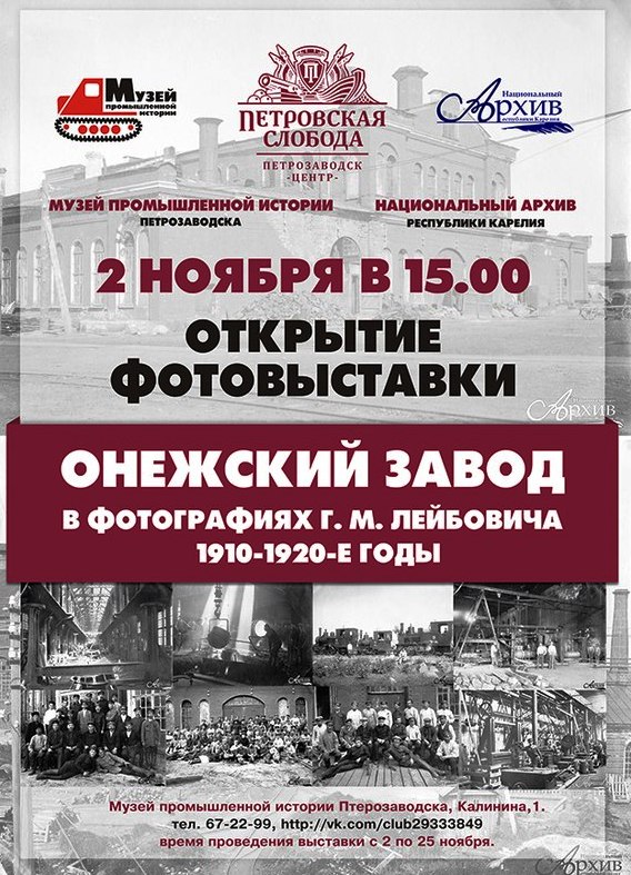 Эта выставка подготовлена совместно с Национальным архивом Республики Карелия. В экспозиции будет представлено 20 ранее нигде не публиковавшихся фотоснимков, на которых запечатлен Онежский завод начала XX века. Групповые портреты, виды цехов, фото заводского автопарка и заводских плотин - эти снимки сохранили жизнь главного городского предприятия в начале прошлого столетия.