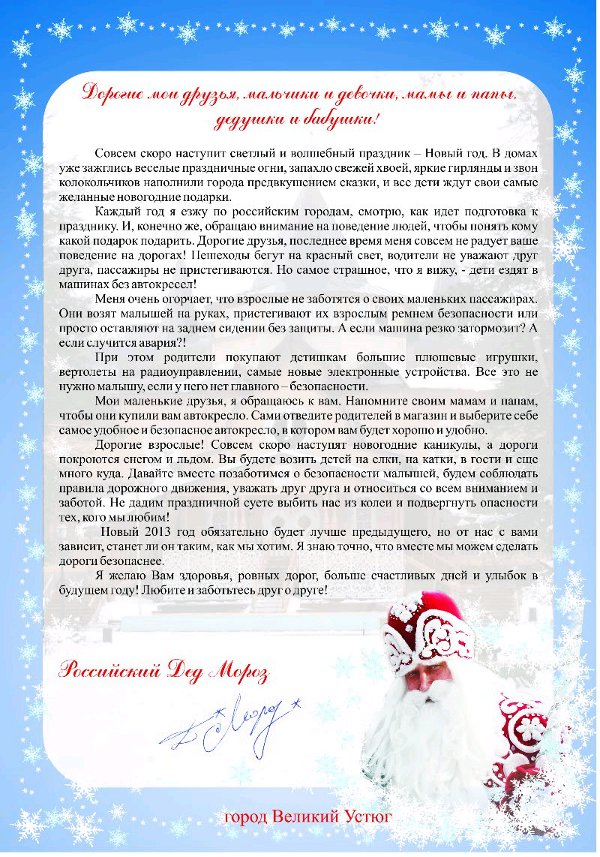 Эта проблема привлекла внимание и самого Повелителя зимы - Деда Мороза. Он написал воззвание к автовладельцам с призывом обязательно обзавестись детским креслом и не подвергать опасности жизнь собственных детей.