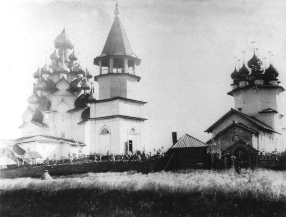 Таким был кижский ансамбль до того, как в 50-х годах сняли внешнюю обшивку