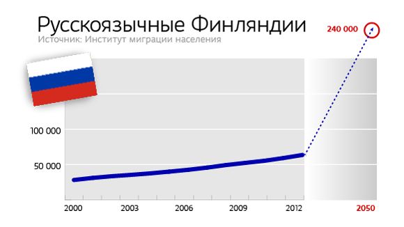 Если темпы роста сохранятся, то к 2050 году русскоговорящего населения в Финляндии будет столько же, сколько шведскоговорящего - то есть от 200 до 250 тысяч.