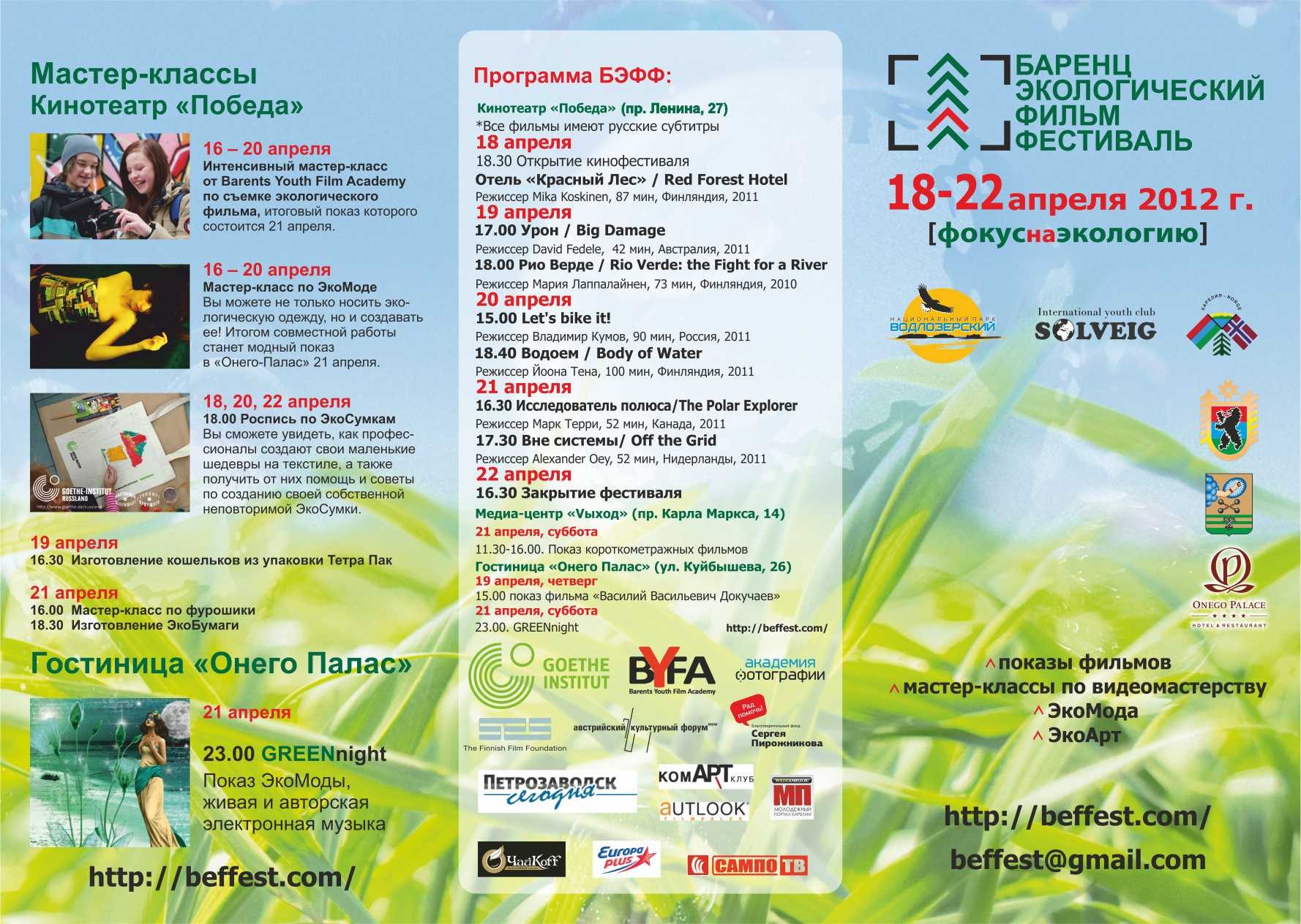 В нынешнем году свои заявки на участие в фестивале направили авторы 200 фильмов из полутора десятков стран. Жюри предстоит определить победителей в девяти номинациях: «Гран-при фестиваля», «Полнометражная программа художественного кино», «Программа документального кино», «Приз короткометражной программы», «Приз зрительских симпатий», «Карельский взгляд», «Лучший фильм о Карелии», «Природа и малые народы» и «Дебют». Зрители и авторы фильмов смогут принять участие в выставках экологического плаката и фотографии, показах экомоды и кулинарных поединках. Кроме того, в рамках фестиваля в Петрозаводске впервые пройдет «Весенний бал цветов» и выступит норвежский музыкант Moddi.