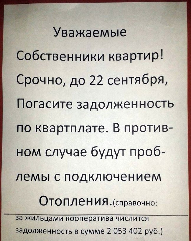 Дело не этом,сейчас потенциальные грамотные покупатели квартир,интерисуются задолжностью ТСЖ и коопер.по коммунальным услугам.Все понятно для незнайки?