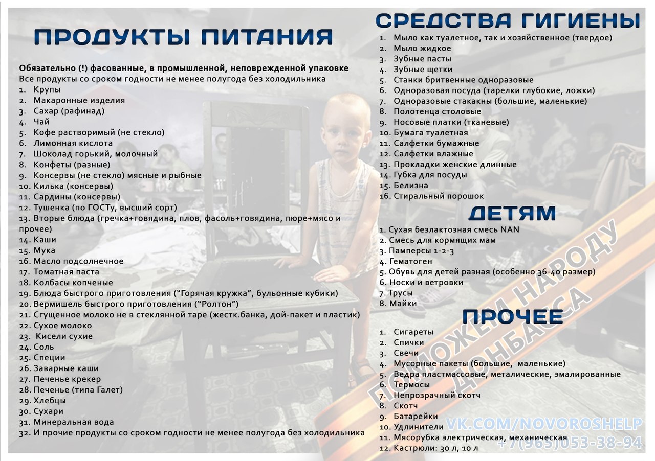 Все, кто желает присоединиться к акции, могут помочь с одеждой - трусы, носки, футболки, обувь, все должно быть новое. Продуктовые наборы - чай, кофе, сахар, сгущенка, тушенка, галеты, любые крупы, каши быстрого приготовления, мука, макароны. Если вы упаковываете коробки сами, не забывайте подписывать, что внутри. Упаковывать лучше в коробки размером не более 35х25х25 см.
