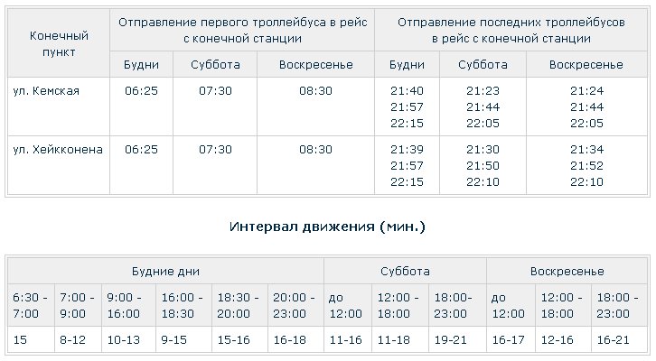 Время отправления троллейбусов с конечной станции «Ул. Хейкконена»: