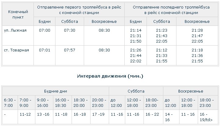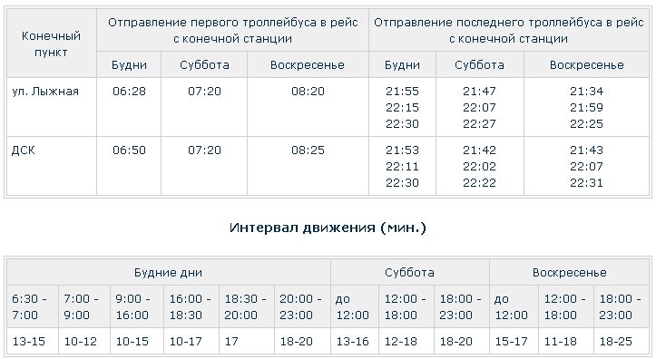 Расписание движения троллейбусов составляется для каждого маршрута в отдельности: на зимний, летний и осенний период, с учетом изменения пассажиропотока и нормирования скоростей сообщения. Расписание предусматривает заезд троллейбусов в депо для проведения планово-предупредительной системы осмотра троллейбусов. Расписание согласовывается в администрации города.