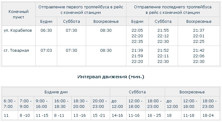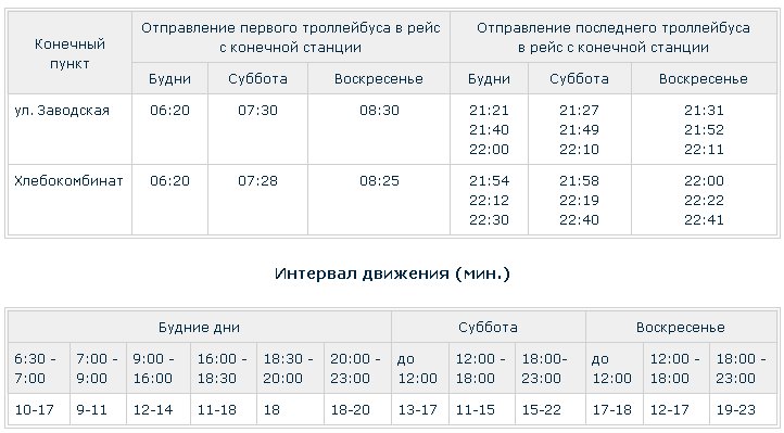 Маршрут № 8 работает по будням в «часы пик». Время отправления троллейбусов с конечной станции «Ул. Заводская»: