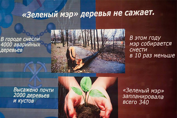 На сегодняшней сессии Петросовета депутаты, готовясь поставить "политическую двойку" Галине Ширшиной за работу в 2014 году, оформили большой баннер с информацией о провальной работе мэра. Один из пунктов касался программы озеленения города: в 2012-2013 годах в Петрозаводске снесли 4000 аварийных деревьев, а в этом собираются снести в 10 раз меньше. Этот пункт был проиллюстрирован фотографией поваленного дерева.