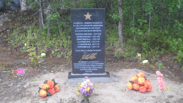 Поисковики также открыли памятный знак воинам 367-й стрелковой дивизии, погибшим на Карельском фронте: среди имен героев-защитников на мемориале значится имя погибшего деда губернатора Курганской области Алексея Кокорина, а так же имя дяди известного карельского журналиста Сергея Никулина.