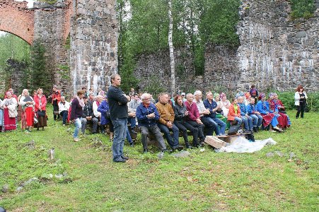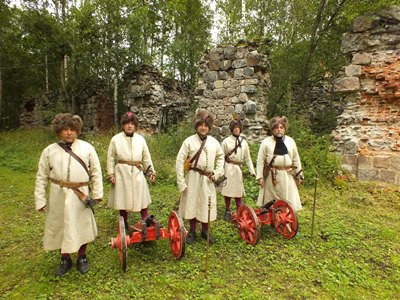 Гостей праздника также развлекали русскими, карельскими и финскими песнями, экскурсиями; кормили пирогами и ухой. А чтобы «закрепить» экскурс в прошлое не только руинами завода, участники клуба исторической реконструкции выступили в нарядах стрельцов времен Петра Великого и дали несколько торжественных залпов из пушек - от их грохота сработала сигнализация на стоящих поблизости автомобилях.