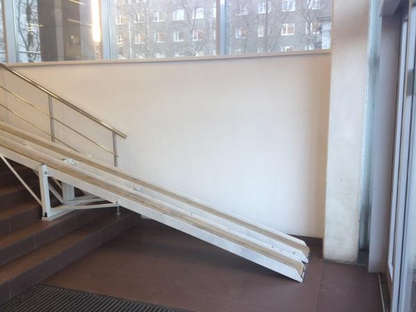 И какие проблемы. Видно же, что пандус не закреплен жестко. В случае необходимости его можно подвинуть как раз напротив входной двери.. Или там наплыв инвалидов колясочников?