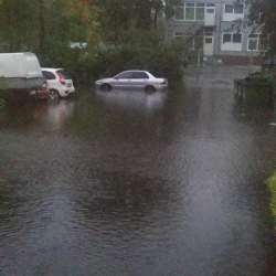 Сегодня в Петрозаводске из-за сильного ливня, который начался ночью и продолжается до сих пор. Затопило дворы и улицы. Жители Петрозаводска делятся фотографиями заполненных водой дворов в соцсетях.